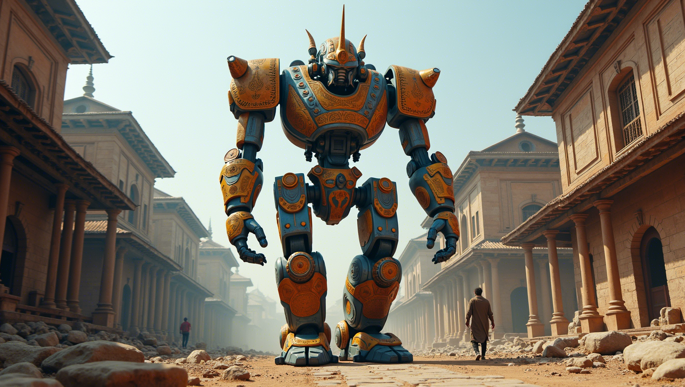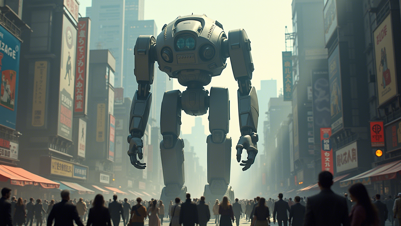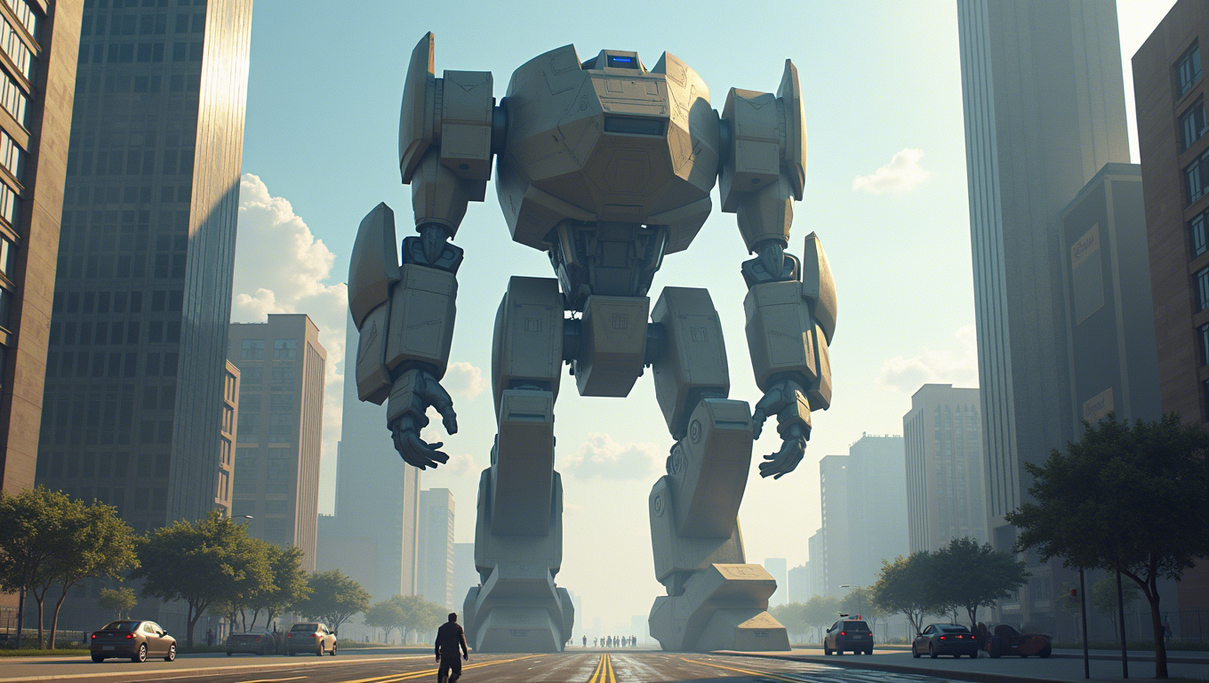거대 로봇, 도시, 미래 도시, 스케일, 건축물, 기술, 파괴, 웅장함, 인공지능, 문명
