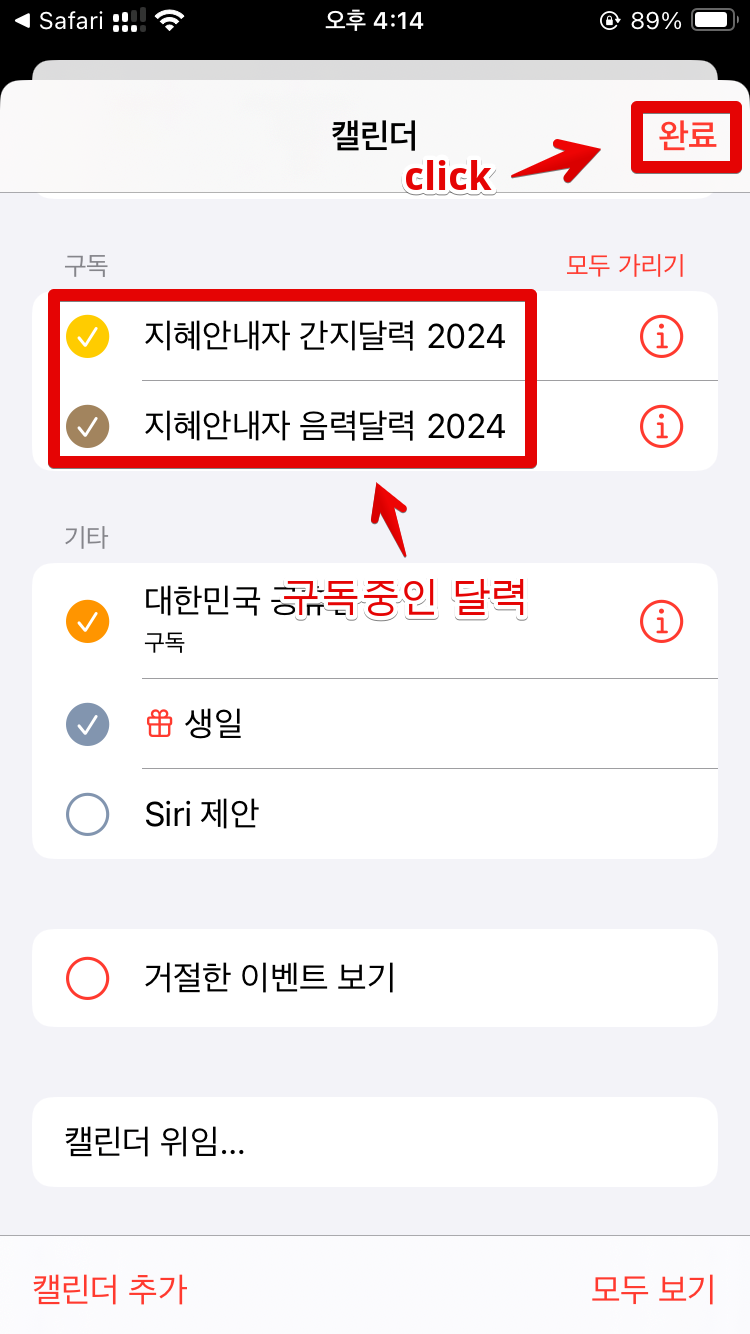 이제 "캘린더"어플을 실행하면 아래 이미지처럼 여러가지 지혜안내자 달력을 볼 수 있습니다.