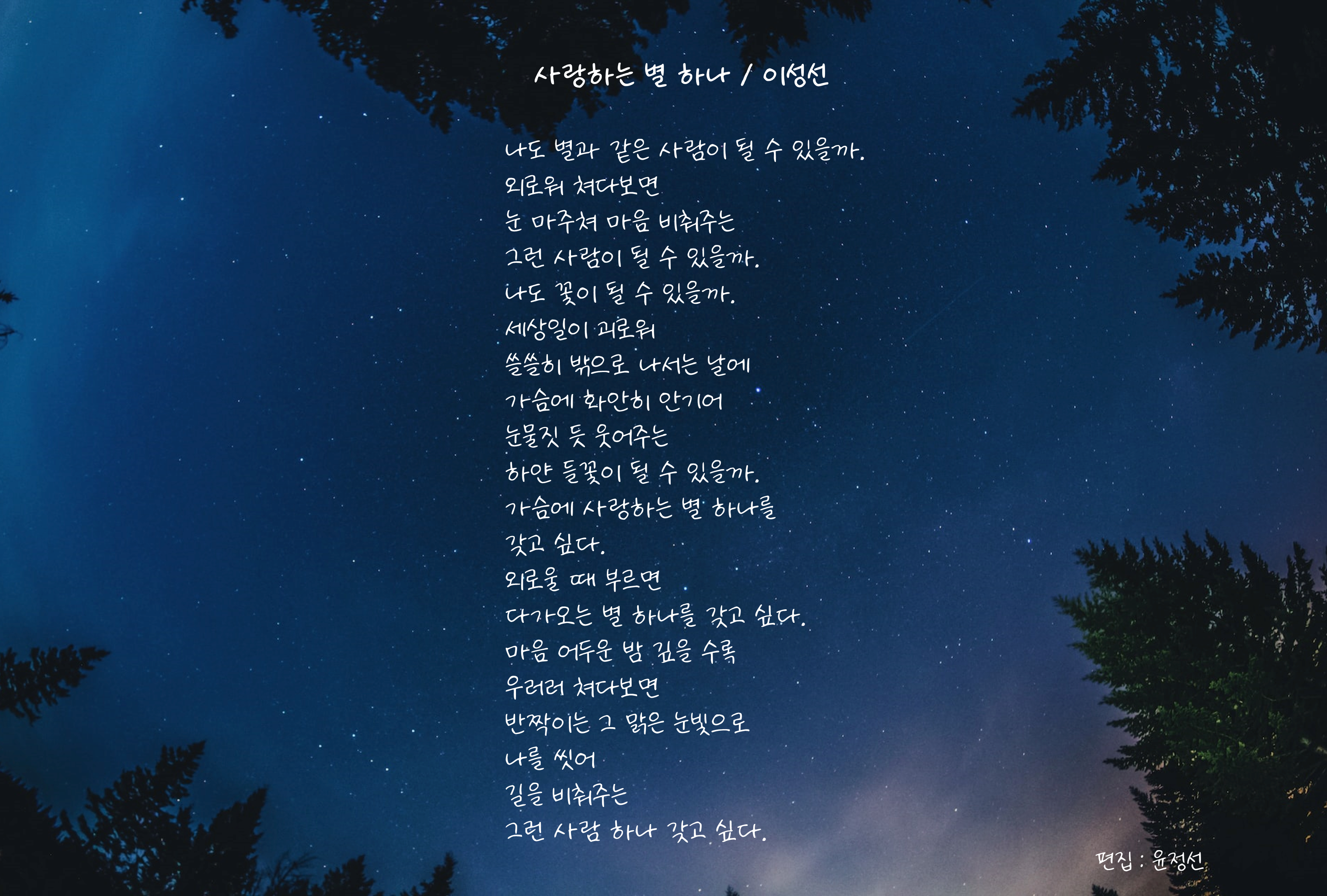 이성선 시인님의 "사랑하는 별 하나"를 예쁜 손글씨로 만들어봤습니다.