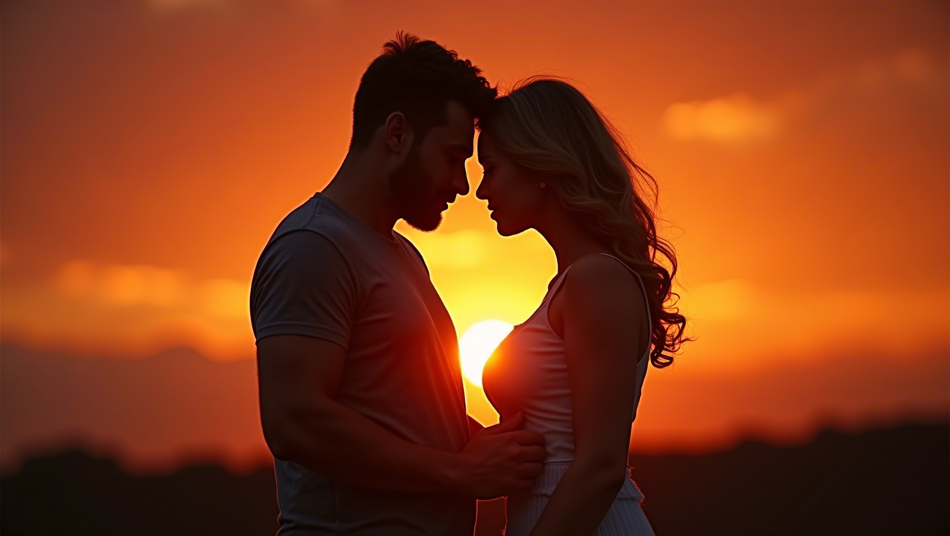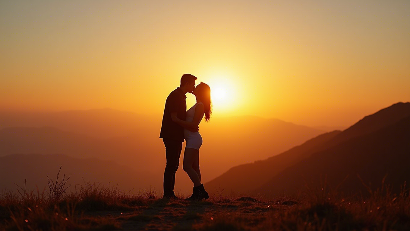 석양 아래 실루엣으로 표현된 사랑하는 연인