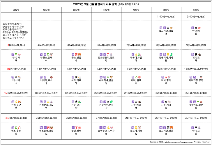 2023년 9월 신유월 별자리 사주 달력
