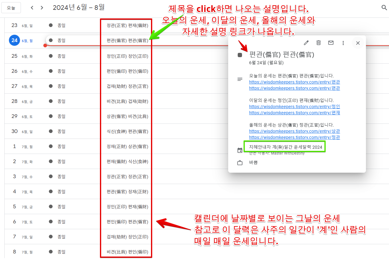 제목을 click하면 해당 요일의 60간지 설명 링크를 볼 수 있습니다.